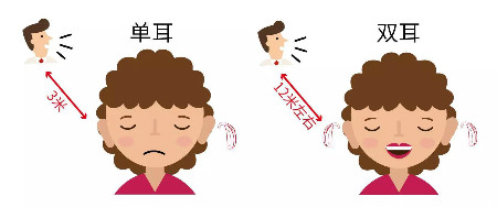 雙耳可以聽到非常遠(yuǎn)的聲音,有數(shù)據(jù)顯示,同樣一個(gè)聲音,單耳聆聽范圍不到10英尺(約3米),雙耳卻可以聽到大于40英尺(約12米)的距離。