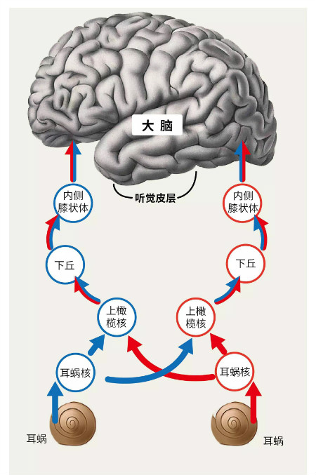 人類的大腦,偉大神秘,當(dāng)外界有聲音來臨時(shí),大腦里會(huì)發(fā)生一種獨(dú)特的雙耳處理,根據(jù)所獲得信息,如時(shí)間、強(qiáng)度、相位、頻率等等,利用接受聲音信號有利位置更好的耳朵或從雙耳信號差異中提取有效聲音信息,消除噪聲,從而進(jìn)行一個(gè)同側(cè)或?qū)?cè)信號處理,獲得清晰立體聆聽。因此,雙耳聆聽有助于增加兩側(cè)大腦聽覺通路的活躍性,而單側(cè)聆聽因?yàn)橹淮碳蝹?cè)就容易導(dǎo)致醫(yī)學(xué)上的“聽覺剝奪”現(xiàn)象。見圖一